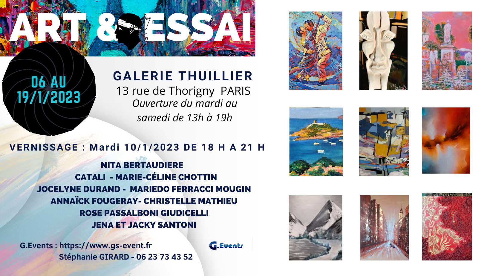 Art & Essai, nouveau concept organisé par G.Events, investie pour l’occasion la galerie Thuillier - 13 rue de Thorigny - 75003 PARIS, du 06 au 19/01/2023, une autre façon de célébrer les voeux des artistes avec un nouveau public mais également avec la galerie lors du salon de Janvier 2023. Ouverture mardi au samedi de 13 h à 19 h. Vernissage : Mardi 10 Janvier 2023 à partir de 18 h.
