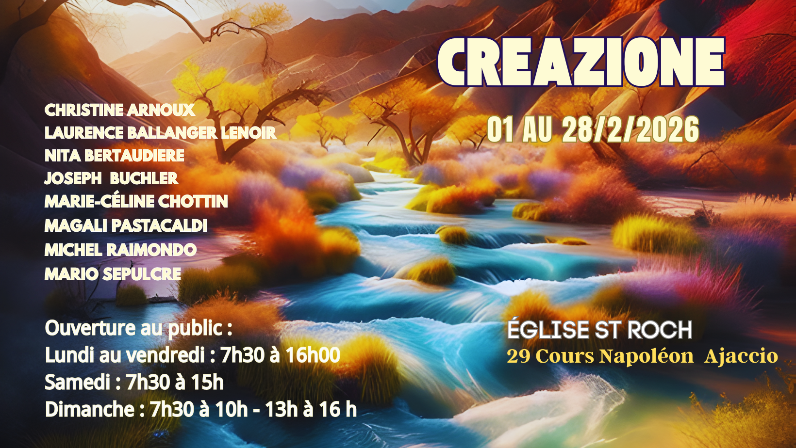 A l'occasion du Centenaire de la Messe des Artistes, une exposition collective est présentée jusqu'au 28 février 2026 à l'Eglise St Roch d'Ajaccio - 29 Cours Napoléon, sur les pilastres, avec la participation des artistes plasticiens : - Christine Arnoux - Nita Bertaudiere - Laurence Balllanger- Lenoir - Joseph Buchler - Marie-Céline Chottin - Magalie Pastacaldi - Michel Raimondo - Mario Sepulcre Ouverture au public : Du lundi au vendredi : de 7h30 à 16h00 Samedi : de 7h30 à 15h Dimanche : de 7h30 à 10h et de 13h à 16h
